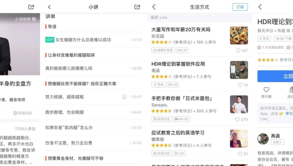课程模式是今年竞争比较激烈的领域,主要的代表是分答小讲、知乎live还有一块听听。分答小讲的对主讲有比较严格的筛选机制,按照机构化的方式进行输出,每个主题都被拆成了若干章节便于检索,交流互动放在内容之后;知乎live则是工具化定位,讲主对外是开放申请的,有评分系统,卖点主打实时交流。