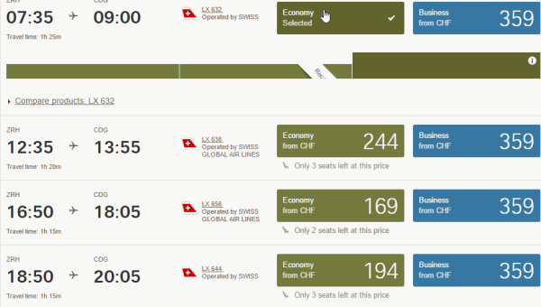 Swiss Air的应用程序就是一个常见方法的例子。在票价表中,每排成为折叠的手风琴,如果需要可以打开。
