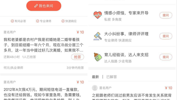 2. 问答模式推出了一种抢单模式的新形态快问,问题量与回答速度都还不错,但是仅仅保留了健康、法律、情感和育儿 4 个类别。