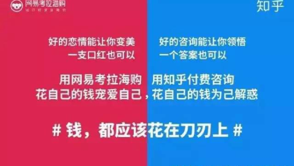 比如,知乎的海报:“恋情可以让你变美,一支口红(选项1)可以,咨询可以让你领悟,一个答案(选项2)也可以”。