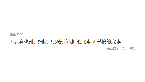 在需要制定定时任务或修复错误数据时,很多时候技术会告诉你“这里需要跑一个脚本”。从百度汉语的翻译中可看到,脚本其实是剧本的意思。演员按照脚本演绎表演内容,每一个场景、动作、对白都是事先编排好的。
