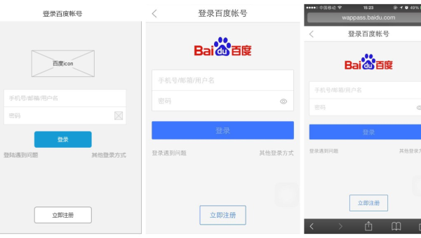 如下组图所示,图1为登录页面的原型设计,通过简单的元件及文字表达出产品经理想要的页面效果;图2是UI设计后的一张平面效果图,图3则是通过前端开发出的具有交互效果的html网页,可完成输入、删除、点击等众多操作。