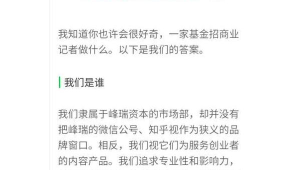 相比杜蕾斯和海尔,去年在VC圈内颇受好评的“峰瑞资本”公众号,可能提供了机构新媒体更值得借鉴的一种样本。和大多数VC业的公众号不同,“峰瑞资本”所推送的内容有大量是值得投资者、创业者参考的案例分享,原创程度也很高,这部分内容同样可以起到激发分享、获取流量的作用,同时它带来的流量更加精准,和机构的主营业务有密切的关系。同时,这又展现了峰瑞资本这家机构的专业度和聪明程度——这对于过滤潜在用户来说是很有用的。