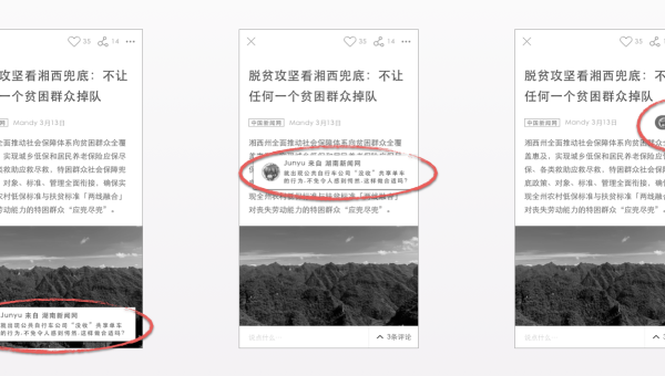 互动类的新闻详情页,一般会推送某些比较好,或者关注度较高的内容,通过阅读过程,不打扰的方式送达到用户面前。有的时候你会发现,网友的评论会比新闻本身更加有趣。互动类的阅读内容更像是个性化阅读产品。通常情况下,跟贴能够增强你的快乐,也会看到自己的影子,在简单的新闻背后加强内心感受。