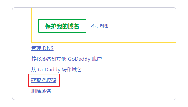 3、获取域名转出授权码。到域名界面,点击获取域名授权,稍等一会儿Godaddy就会发送一封邮件到你的注册邮箱当中,请注意查收一下。