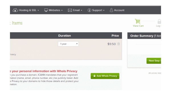 3、接着,会进入到Name.com的购物车里,你可以看到转入一个.com域名需要支付9. 5 美元。(点击放大)